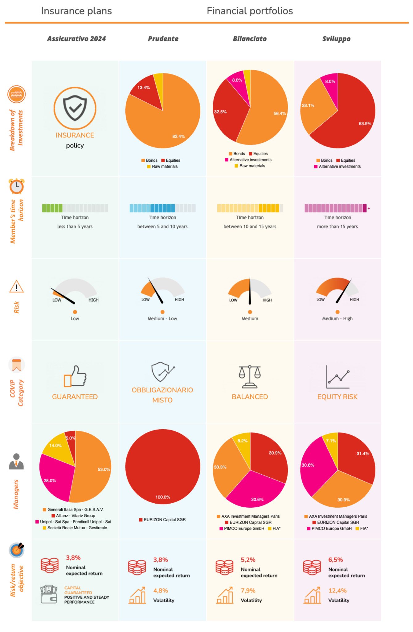 L’offerta di investimento agli iscritti prevede la possibilità di scegliere tra tre comparti differenti, che si caratterizzano per un diverso profilo di rischio/rendimento. Si tratta del comparto garantito, Assicurativo 2024, che non solo protegge il capitale (non è possibile subire perdite) ma prevede anche un rendimento minimo dello 0,5%; del comparto Bilanciato, che ha un portafoglio costituito prevalentemente da obbligazioni, sebbene con una quota di azionario significativa e di Sviluppo, con una composizione prevalentemente azionaria. Inoltre, Previndai permette di personalizzare al massimo il proprio investimento previdenziale, con la possibilità di scegliere più di un comparto contemporaneamente. E’ anche possibile decidere di scegliere uno o più comparti per la posizione già accumulata e un altro o altri per i versamenti futuri, oppure destinare entrambi agli stessi comparti.